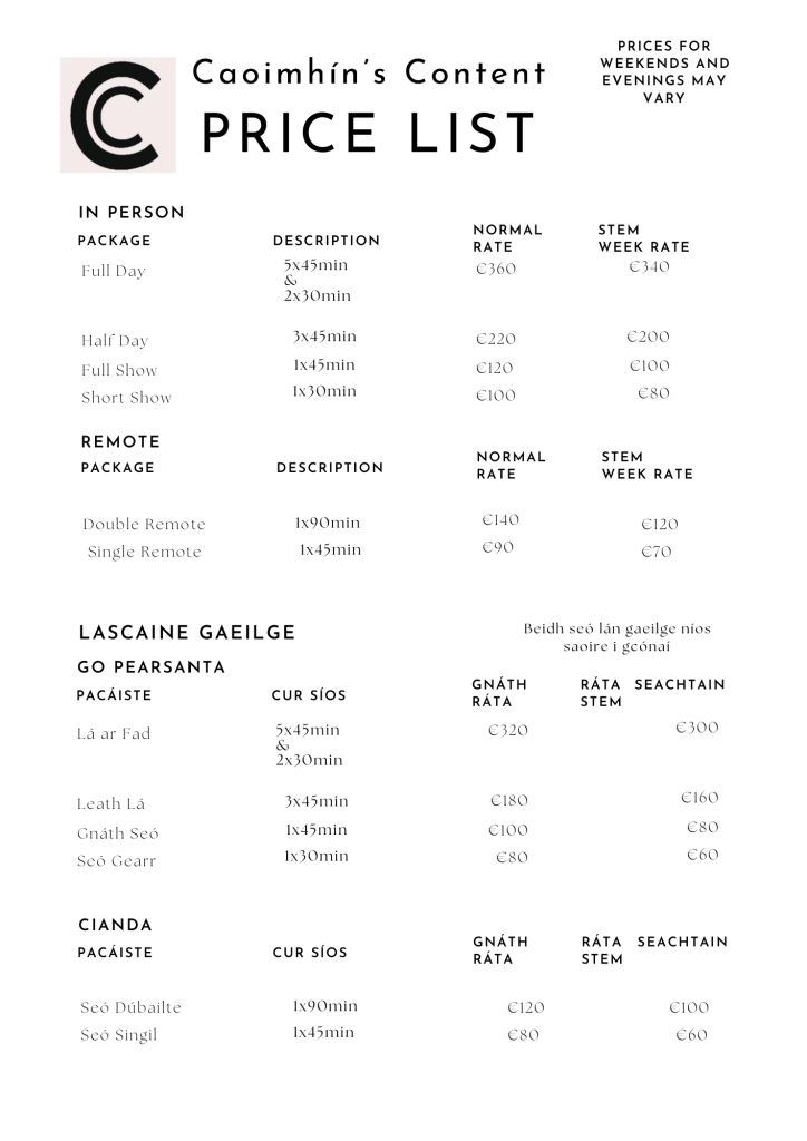 Please note that, although I am happy to provide translations, shows in Irish will be presented in Irish. Irish terms can also be provided in English languages shows if requested.